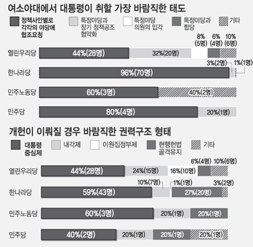 ▽“개헌은 대통령중심제가 될 것”=설문조사 내용 중 ‘최근의 연정 발언 등에 비춰볼 때 대통령이 내심 지향하는 권력구조가 뭐라고 보느냐’는 질문에 대한 답변은 내각제(한나라당 응답자의 38%, 열린우리당 응답자의 27%)와 이원집정부제(한나라당 25%, 열린우리당 37%)가 다수였다.