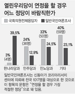 다만 열린우리당 응답자들은 야당에 비해 그 비율이 다소 적었다(합당하지 않다 59%, 실현가능성 없다 83%). 이는 최근 연정 대상에 한나라당까지 포함시킬 수 있다고 밝힌 당 지도부를 의식한 결과로 보인다.