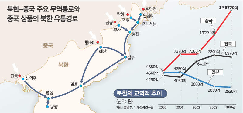 이는 지난해 북한이 유치한 외국 투자액 5900만 달러의 85%에 해당한다. 2003년 중국의 대북 투자가 130만 달러에 불과했다는 점을 감안하면 비약적인 증가 추세다.