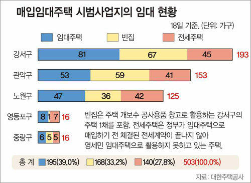 지난해 9∼11월 매입한 주택의 28% 정도인 140가구가 아직까지 기존 전세계약이 끝나지 않아 영세민용 임대주택으로 사용할 수 없다는 것도 실태조사가 부실했음을 보여 준다.