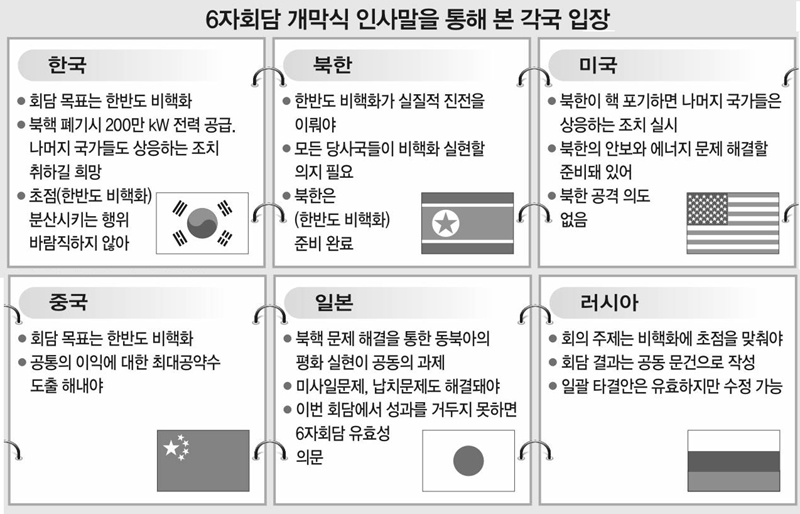 의장국인 중국은 충실한 조정자 역할을 자임하면서 쉬운 것부터 단계적으로 풀어가자는 입장이다. 리자오싱(李肇星) 외교부장은 이날 환영사를 통해 “일치하는 점은 취하고 의견이 다른 점은 잠시 보류하면서 공동 인식을 추구하자”며 “중국은 각 측과 의견 조율을 계속 하겠다”고 말했다.