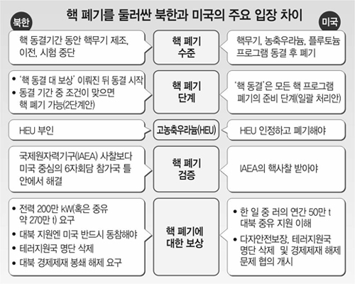 북한은 한반도 비핵화를 북핵에 국한하지 않고 한국과 일본에 대한 미국의 핵우산까지 포함한 개념으로 여기고 있다. 북핵 폐기를 목표로 하고 있는 미국 등 다른 참가국들과는 회담의 출발선부터 달리하는 것.
