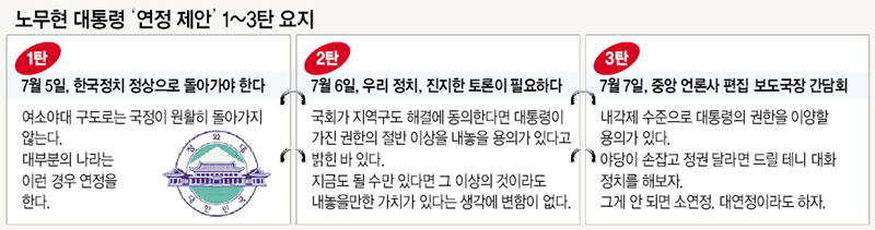 이 제안은 두 차례의 권력 이양을 포함하는 것이다. 대통령의 권력을 열린우리당에 이양하고 동시에 열린우리당은 다시 이 권력을 한나라당에 이양하는 것이다. 권력을 이양하는 대신 우리가 요구하는 것은 지역구도를 제도적으로 해소하기 위해 선거제도를 고치자는 것이다.