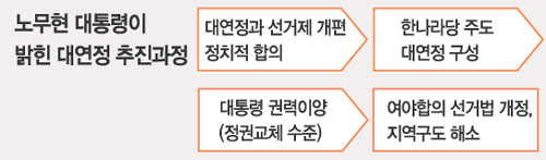 노 대통령은 이런 상황을 예측하고 자신의 주도로 판을 바꾸겠다는 강한 의지를 실천에 옮기고 있는 것으로 보인다. 설사 실패하더라도 야당의 ‘발목잡기’를 차단하는 효과가 있다.