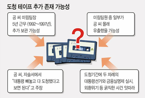 이와 관련해 공 씨가 검찰이 압수한 도청 테이프와는 다른 도청 테이프를 집이 아닌 다른 곳에 보관하고 있을 가능성이 제기되고 있다.
