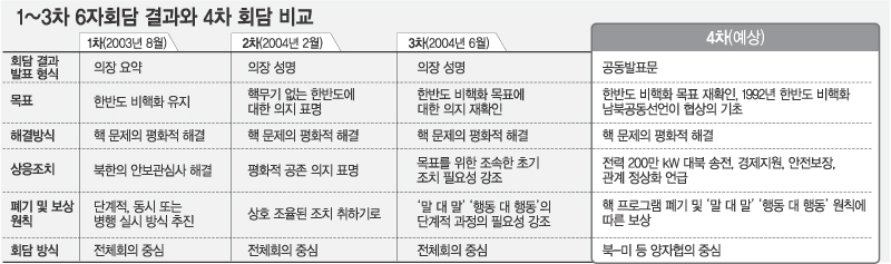 1∼3차 6자회담 때는 북-미 간의 입장차가 워낙 커 회담 결과물에 ‘핵 폐기’란 단어를 단 한 번도 넣지 못했다. 지난해 6월 3차 회담의 의장 성명에선 ‘비핵화를 위한 초기조치’라는 모호한 표현만 담았을 뿐이다.