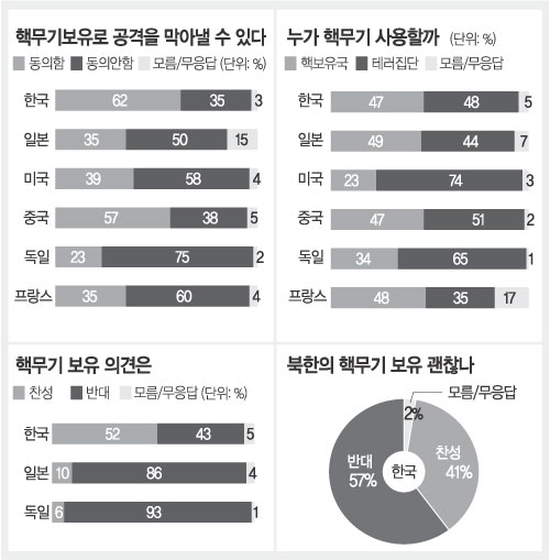 ▽핵무기 보유=‘앞으로 핵무기 보유국이 늘어날 것으로 보느냐’는 질문에는 대체로 핵무기 보유국(미국 76%, 중국 75%, 프랑스 63%)에서 늘어날 것이라는 응답이 높게 나온 데 비해 핵무기 비보유국에선 53∼55%로 상대적으로 낮았다.