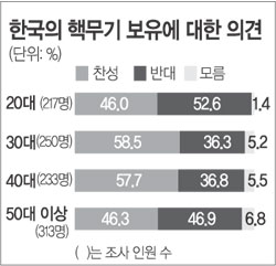 한국이 앞으로 핵무기를 갖는 것에 대해 30대의 58.5%, 40대의 57.7%가 찬성 입장을 밝혀 전체 찬성률(51.9%)을 훨씬 상회했다. 반면 20대는 46%, 50대 이상은 46.3%만이 찬성했다.