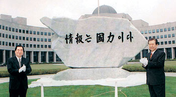 ![]() 1998년 5월 12일 김대중 대통령(오른쪽)이 국가정보원으로 이름이 바뀐 국가안전기획부를 방문했다. 김 대통령은 이날 ‘음지에서 일하고 양지를 지향한다’는 부훈을 ‘정보는 국력이다’로 바꾸고 원훈석 제막식을 가졌다. 동아일보 자료 사진 |