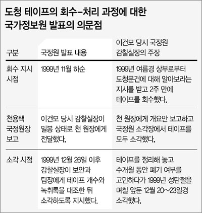 그러나 이 전 실장은 “1999년 여름 상부로부터 도청 문건에 대해 알아보라는 지시를 받았다”고 밝혔다. 국정원의 발표와 이 전 실장의 진술에 무려 2, 3개월의 차이가 존재한다.