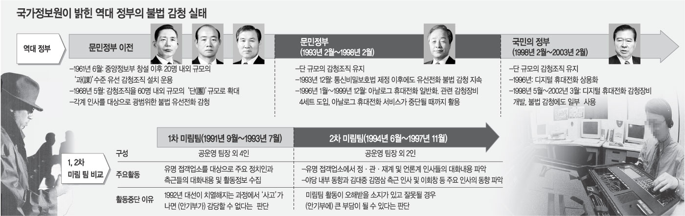 중앙정보부 시절부터 존재하던 미림팀이 도청 등 첨단수법을 사용하게 된 것은 1991년 9월 공운영(孔運泳) 씨 주도로 5명으로 구성된 팀이 만들어지면서부터였다. 이 팀은 김영삼(金泳三) 정부 들어 1993년 7월 해체됐다가 이듬해 6월 공 씨 등 3명으로 다시 구성돼 1997년 11월까지 3년 5개월 동안 주요 인사의 동향을 도청했던 것으로 밝혀졌다.