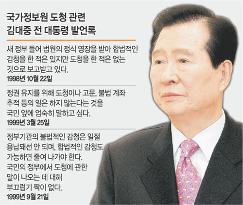 ▽DJ는 몰랐나=국정원은 이날 김 전 대통령의 도청 사실 인지 및 정보보고 여부에 대해 “김 전 대통령은 불법 감청을 없애라고 했기 때문에 위에까지 보고하지 않았다”며 선을 그었다. DJ 측도 “어떤 불법 활동도 보고받은 바 없다”고 했다.