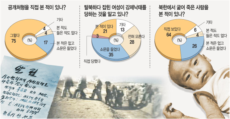 ▽강제 낙태 및 공개 처형=국회 법제사법위원회 김재경(金在庚·한나라당) 의원이 최근 인권위에서 입수한 보고서에 따르면 설문조사 결과 탈북자의 3%가 직접 강제낙태를 당했고 21%가 강제 낙태를 목격한 것으로 나타났다.