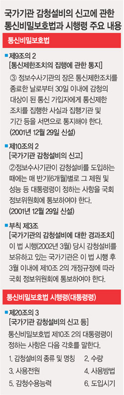 첫째, 통신비밀보호법의 개정이다. 국정원이 감청 장비를 폐기했다고 밝힌 2002년 3월은 공교롭게도 2001년 12월 29일 신설된 통비법 제10조 2항 ‘국가기관 감청 설비의 신고’ 조항이 시행된 시점과 맞아떨어진다.