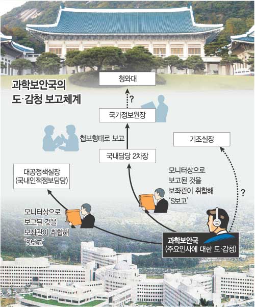 ▽누가 보고 받았나=도청 내용은 국내담당 2차장과 대공정책실장에게 온라인으로 수시로 보고됐다.