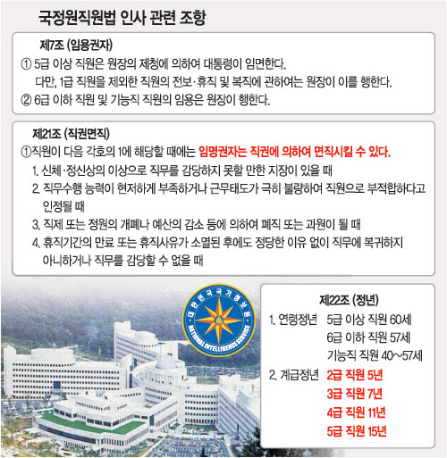 ▽고질화된 신분 불안=국정원직원법상 국정원장은 직원의 생살여탈권을 쥐고 있다. 임면권뿐 아니라 1급 직원을 제외한 직원의 전보나 휴직 복직도 모두 원장 마음대로 할 수 있다. 특히 직권면직 조항(제21조)을 보면 ‘근무태도 불량, 직무수행 능력 부족’ 등 모호한 기준으로도 얼마든지 내보낼 수 있도록 돼 있다.