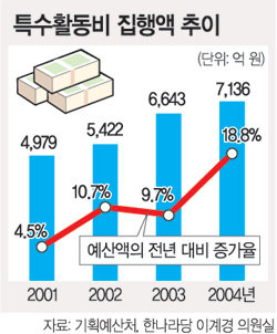 9일 국회 예산정책처가 국회 예산결산위원회 소속 한나라당 이계경(李啓卿) 의원에게 제출한 자료에 따르면 특수활동비 예산은 1994년 이후 10년간 2.5배 증가했고 전년 대비 증가율도 매년 10% 안팎에 이른다.