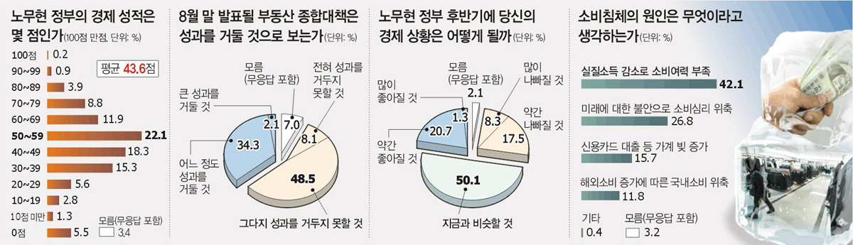 이번 여론조사에서는 저조한 성장에 따른 국민의 불만이 그대로 표출됐다. 잘못한 분야 상위권을 모두 경제 분야가 차지했다. 노무현 정부가 집권 후반기에 중점을 두어야 할 분야 1∼3위도 경제 회복(53.7%), 빈부격차 해소(12%), 부동산 안정(9.8%) 등 경제 분야가 휩쓸었다.