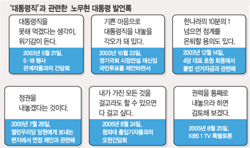 노 대통령은 2003년 10월 불법 대선자금 문제가 불거졌을 때에도 재신임 국민투표를 제안하는 등 대통령 직을 건 모험적 제안을 내놨다. “대통령 직 못 해먹겠다는 위기감이 든다” “정계를 은퇴할 용의가 있다”는 등 극단적인 발언도 여러 차례 했다.