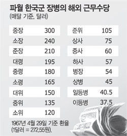 ▽해외 근무수당의 전용 의혹=공개 문서에 따르면 파병 장병의 해외 근무수당은 매달 중장은 300달러, 이등병은 37.5달러였다. 당시 국내 봉급은 중장은 월 175달러, 이등병은 월 1달러 수준. 정부는 이를 장병에게 전액 직접 지급하지 않고 80% 이상을 일괄 공제해 본국의 가족에게 송금했다.