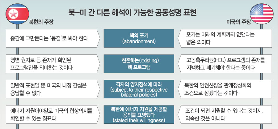 미국이 북한과 상반되는 주장을 펴는 것도 역시 모호한 공동성명에 대한 나름대로의 해석에 기반을 둔 것이다.