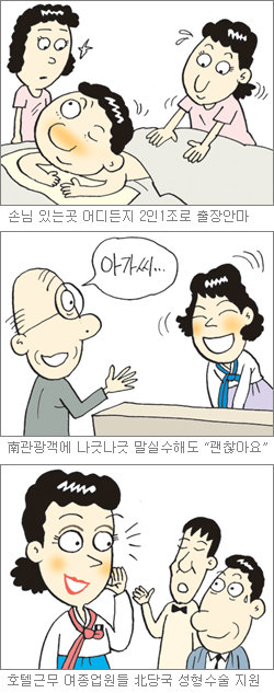 ▽북측여성도 성형미인?=양각도호텔 식당에서 봉사원으로 활동하는 한 여성은 “유달리 북측 여성들은 쌍꺼풀이 있는 사람이 많다”는 기자의 질문에 “장군님(김정일 국방위원장 지칭)께서 원하는 사람들 모두에게 쌍꺼풀 수술과 코 높이는 수술을 해줬습니다”라고 말했다.