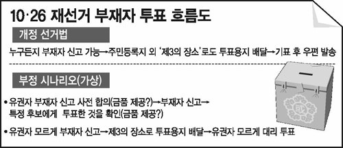 경기 광주, 부천 원미갑, 대구 동을, 울산 북 등 4개 재선거 지역에서 얼마든지 일어날 수 있는 일이다. 8월 4일 개정된 공직선거법에 따라 군인 경찰공무원 등이 아닌 일반인도 신고만 하면 부재자투표를 할 수 있다. 특히 재·보선의 경우에는 총선 때와 달리 부재자투표소를 따로 마련하지 않고 집이나 직장 등에서 우편으로 투표용지를 받아 ‘거소투표’를 할 수 있다.