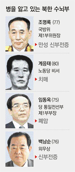 김 국방위원장을 제외하고 군의 최고 실세로 통하는 조 제1부위원장은 만성 신부전증을 심하게 앓아 신장 2개를 모두 이식받은 것으로 알려졌다. 또 계응태(桂應泰·80) 노동당 비서는 치매에 걸렸으며, 백남순(白南淳·76) 외무상은 신부전증을 앓고 있다는 것.
