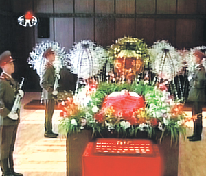 ![]() 연형묵 북한 국방위원회 부위원장의 영구가 23일 평양시 보통강구역 서장구락부에 안치됐다. 조선중앙TV를 촬영한 것이다. 연합뉴스