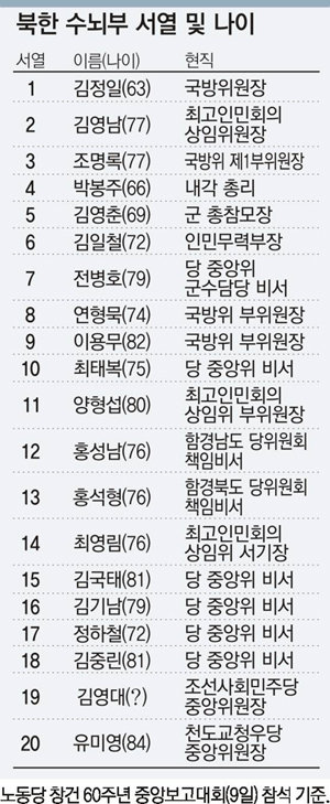 9일 노동당 창건 60주년 기념 중앙보고대회에 참석한 김영남(金永南·77) 최고인민회의 상임위원장과 조명록(趙明祿·77) 국방위 제1부위원장 등 고위층 20명 중 70세 이상이 16명이나 되는 것으로 확인됐다. 이들 중 나이가 확인된 19명의 평균 나이는 75.7세였다.