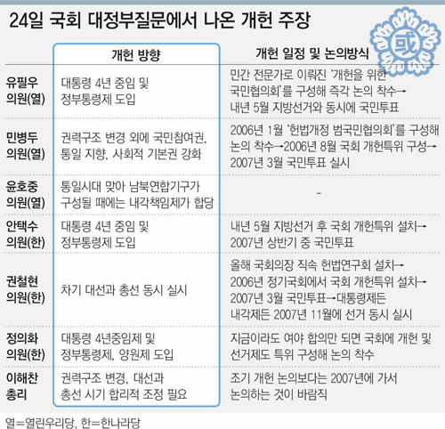 ▽여권의 복안은 전면적 개헌?=이해찬(李海瓚) 국무총리는 이날 대정부 질문에 대한 답변에서 “이번에는 새로운 헌법을 만든다는 수준에 이를 정도로 충분한 토의가 필요하다”고 전면적 개헌론을 제기했다.