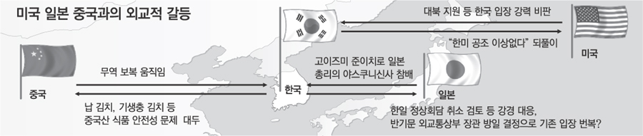 한국이 최근 미국 일본 중국 등 주요 국가들과 외교적인 문제로 부딪치고 있다.