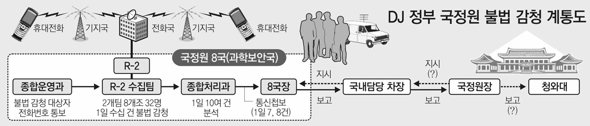 국정원은 1999년 9월 R-2 6세트를 개발해 본격 운용했다. R-2는 통신회사의 유선중계통신망 회선에 감청장비를 연결해 그 회선을 통과하는 모든 통화 내용을 감청할 수 있는 장비. 도청 업무는 국정원 8국(과학보안국) 운영단 소속 국내수집과의 ‘R-2수집팀’이 맡았다.