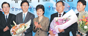 ![]() 한나라당 박근혜 대표(가운데)가 27일 서울 강서구 염창동 당사에서 국회의원 재선거 당선자들과 환하게 웃고 있다. 왼쪽부터 강재섭 원내대표, 유승민(대구 동을) 당선자, 박 대표, 정진섭(경기 광주) 임해규(경기 부천 원미갑) 당선자. 윤두환(울산 북) 당선자는 이날 울산 공항 비행기가 안개 때문에 결항하는 바람에 참석하지 못했다. 김경제 기자 |
