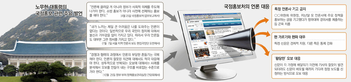 국정홍보처는 8월 말 각 부처 홍보관리실에 보낸 ‘정책 홍보 업무처리에 관한 기준’에서 ‘정부 정책을 악의적으로 왜곡하거나 현저하게 사실과 다른 보도를 지속하는 매체’에 대해서는 특별회견이나 기고를 하지 말라고 ‘주문’했다. 중앙부처의 홍보 관계자는 “해당 매체는 동아일보와 조선일보, 문화일보”라고 귀띔했다.