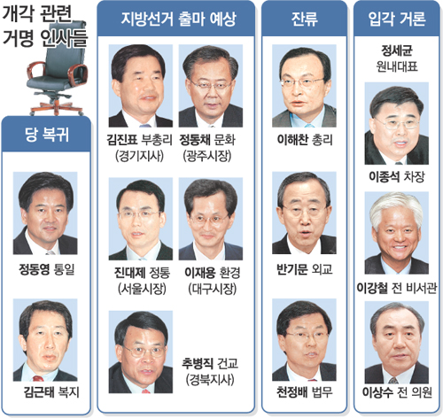 한편 정동영 통일부 장관의 후임으로는 이종석(李鍾奭) 국가안전보장회의(NSC) 사무차장이 유력해 외교안보 라인에도 일정한 변화가 예상된다. 그러나 내년 하반기 유엔 사무총장에 출마할 뜻을 갖고 있는 반기문(潘基文) 외교통상부 장관은 유임될 것이란 전망이 많다.