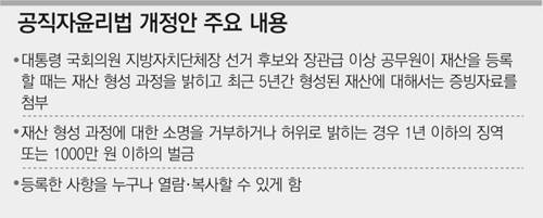 ▽검증 철저하게=열린우리당 김한길 의원 등이 1일 발의한 공직자윤리법 개정안의 취지는 “어떻게 재산을 모았느냐”를 규명하겠다는 것이다. 1993년 김영삼(金泳三) 정부 출범과 함께 처음 도입된 공직자 재산공개제도는 재산의 총규모와 1년 사이 재산의 증감액은 파악할 수 있지만 재산 형성의 과정에 문제가 없는지는 알 수 없다.