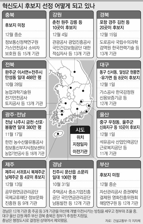 9월 말까지 끝내기로 했던 혁신도시 입지 선정은 30일 현재 4개 시도에서만 마무리됐다. 정부는 이날 11개 시도 관계자가 참가한 ‘정부대책반 회의’를 열고 15일까지는 입지 선정을 완료하기로 합의했다.