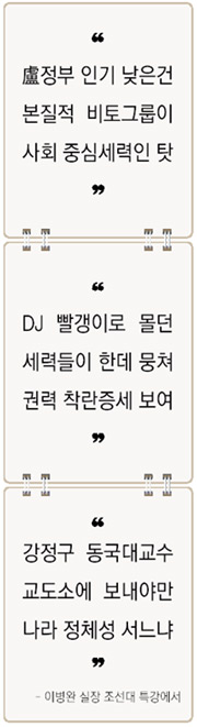 이 실장은 이날 ‘참여정부가 서 있는 자리’란 제목의 조선대 특강에서 “참여정부의 인기가 없고 대통령의 지지도가 낮은 것은 참여정부, 노무현 정권을 인정할 수 없다는 본질적인 비토(veto) 세력이 사회의 중요 세력을 형성하고 있기 때문”이라고 말했다.
