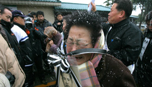 ![]() 13일 남북장관급회담이 열린 제주 서귀포시 롯데호텔 부근에서 납북자가족모임 회원들이 납북자의 송환을 촉구하는 시위를 벌이려다 경찰에 저지당하자 울음을 터뜨리고 있다. 서귀포=강병기 기자 |