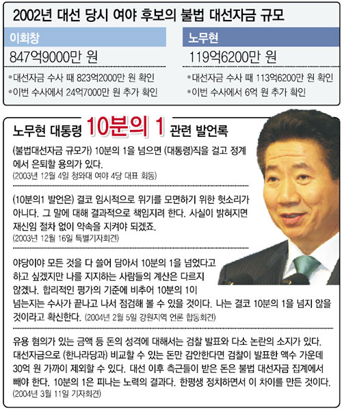 ▽논란 재연된 ‘10분의 1’ 발언=이번 수사 결과 여야의 불법 대선자금 규모는 한나라당 847억9000만 원(대선자금 수사 때는 823억2000만 원), 노무현 캠프 119억6200만 원(대선자금 수사 때는 113억6200만 원)으로 늘어났다. 노무현 캠프의 불법자금 규모는 한나라당의 7분의 1 수준.