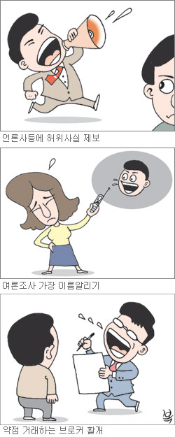 동창회나 향우회 명부를 들고 출마 예정자들을 찾아다니던 선거 브로커도 요즘은 그럴듯한 직함을 내세우며 선거 분위기를 흐리고 있다. 이들은 ‘○○조사연구소’나 ‘지방선거컨설팅’ 같은 유령 업체를 내세우며 지지율 조사비용을 요구하거나 경쟁자에 관한 정보를 ‘판매’하기도 한다.