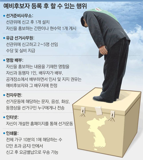 ▽나는 탈법에 기는 단속=선관위는 불법 사전선거운동을 줄이기 위해 ‘예비후보등록제’를 이번 지방선거에 처음으로 도입하지만 그 효과가 의문시되고 있다.