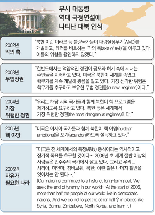 이날 51분간의 연설에서 북한이 직접 거론된 것은 단 한 차례뿐이었다. 그것도 독재국가 5곳을 거론하면서 함께 언급하는 정도였다. 과거에는 최소한 1∼3문장이 할애됐고 ‘악의 축’ ‘무법 정권’ 등 자극적인 표현도 동원됐다. 워싱턴포스트는 연설문을 놓고 “과거 같은 자신만만함보다는 조심스러움이 배어난다”고 평가했다.
