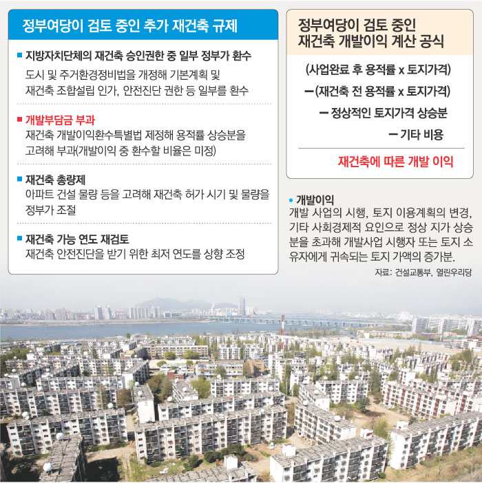 정부와 여당이 ‘극약 처방’이라고 할 만한 대책을 추진하는 이유는 재건축 아파트가 ‘주거용’이 아니라 ‘투자용’으로 인식되고 있기 때문이다. 재건축 아파트 ‘투자’를 통한 시세차익을 줄이면 재건축 아파트 수요가 감소할 것이라는 판단이다.