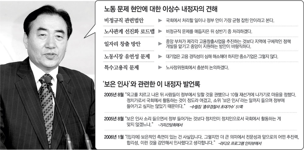 이 내정자는 장관 내정 사실이 발표되자마자 바로 다음 날(1월 3일) 라디오 방송에 출연해 비정규직 관련 입법과 관련해 “밀어붙이는 식의 행정은 하지 않겠다. 이 문제는 기본적으로 사용자의 양보를 얻어내는 부분이 크다”고 말했다. 이는 비정규직 법안 원칙 처리를 강조해 온 기존의 정부 입장과 배치되는 발언이어서 물의가 일었다.