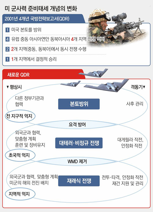 미 국방부는 2001년 10월 발표된 QDR에서 군사력 준비 태세를 ‘미국 본토를 방위하고(1) 유럽 중동 아시아연안 동북아시아 등 4개 지역에서 전쟁을 억지하며(4) 2개 지역에서 동시에 전쟁을 수행하는(2) 한편 이 중 1개 지역에서 결정적으로 승리하는 것(1)’으로 규정했다. 9·11테러가 반영되지 않은 전통적인 개념이었다.