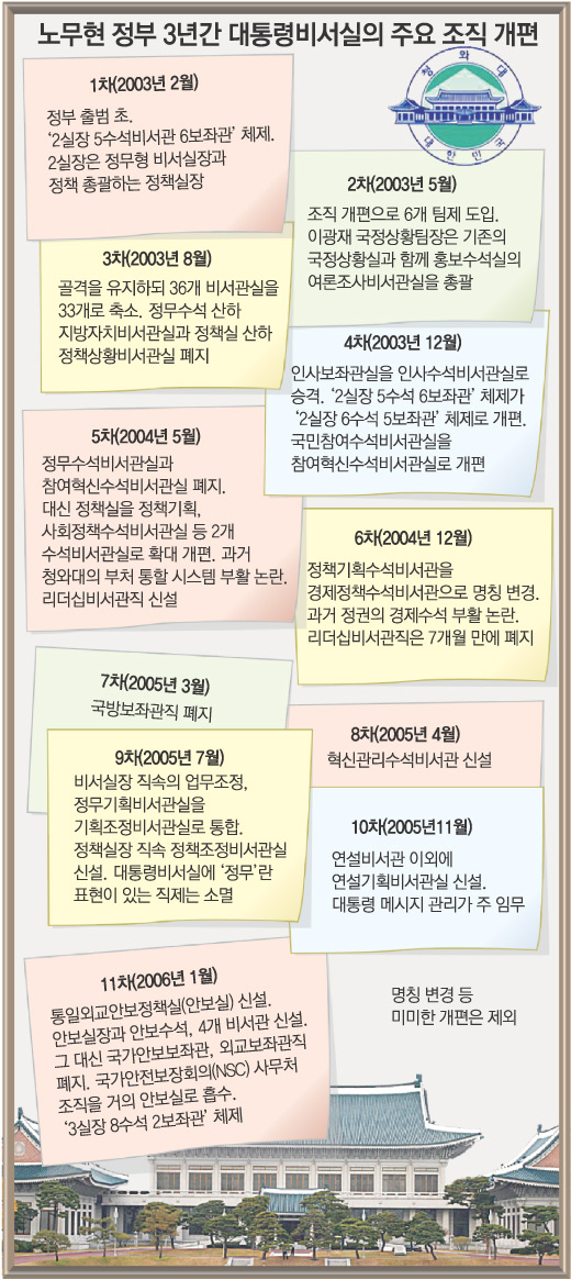 ▽‘합치고, 나누고, 늘리고’=노무현 정부의 대통령비서실은 2003년 2월 출범 이후 10여 차례의 변신을 거듭했다. 비서관직을 신설하거나 통폐합하지 않은 채 이름만 바꾼 경우까지 합치면 횟수는 더 늘어난다.