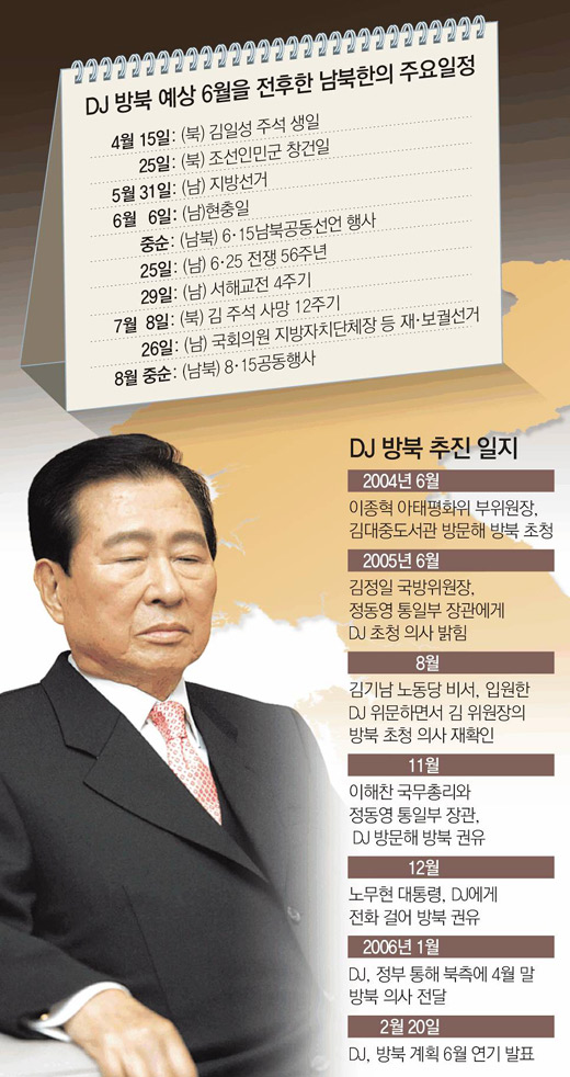 DJ의 방북이 방중(訪中) 이후 구상을 다듬고 있는 김 위원장의 ‘선택과 집중’ 대상에 끼어들 틈이 없을 것이라는 시각도 있다.