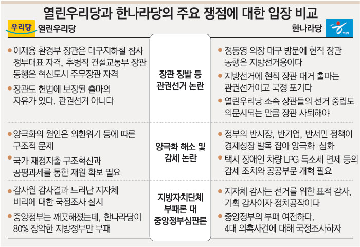 이에 대해 비리 척결의 당위성은 인정하지만 이를 ‘핵심 선거이슈’로 내세우는 것은 문제라는 지적이 나온다. 임성호(林成浩) 경희대 정치외교학과 교수는 “지자체가 비리를 저질렀다면 국정조사든 검찰수사든 하는 게 당연하지만 선거가 얼마 남지 않았음을 감안한다면 시기적으로 적절치 않다는 생각이다”고 말했다.